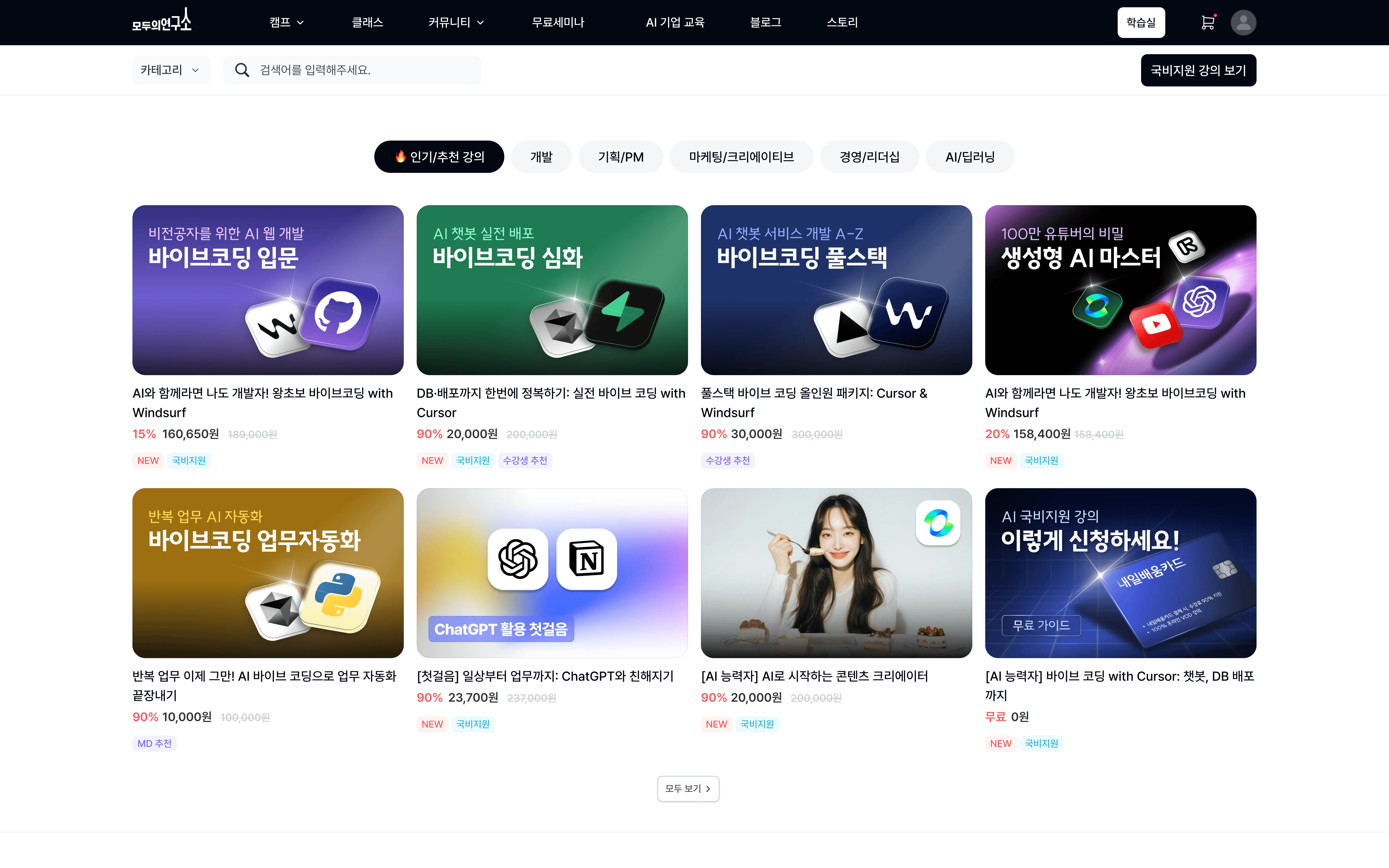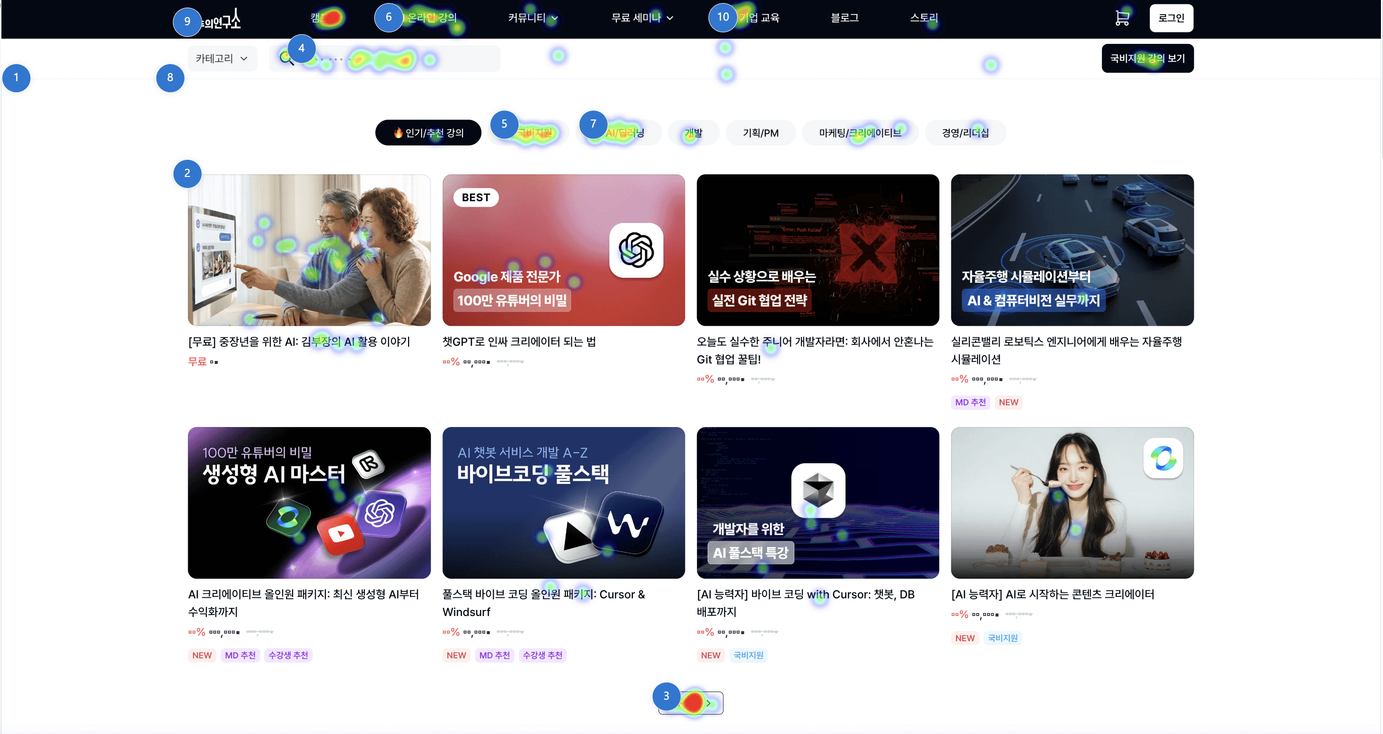 홈페이지 히트맵 클릭 분포를 살펴보면, 직무/카테고리 필터·검색 영역에 클릭이 집중되고, [강의 썸네일] 혹은 [더보기]로 클릭이 이어지는 패턴이 관찰됩니다.